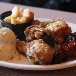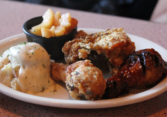The Sampler Platter inclues pan-fried chicken, over-the-coals and barbecue.