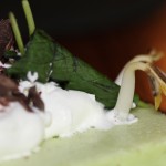 Most of the reviews I read detailed the trouble cooks had with thickening the pie. I tried it for myself and had a little problem with the filling bulking up, so I added 1/4 cup miniature marshmallows, which helped firm up the texture. I did tweak this recipe a little, since I agreed with some of the comments on Stewart’s Web site that this pie lacked enough of a minty fresh taste. Keebler’s Fudge Shoppe Grasshopper cookies used for the crust added even more minty flavor. Also, I thought it would be fun to fold a large mint leaf in half for the body of a grasshopper and add Mung bean sprouts for back legs. I put each of these “insects” on a wedge of pie to see if diners would notice. Some ate right through his legs, while others actually tried to flick the offender off.
