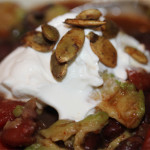 Pumpkorn is pumpkin seeds that are dry roasted with tamari garlic. They are scrumptious as a snack, and the seeds were especially appealing as a buggy garnish atop a sour cream dollop. Fresh cilantro created a swampy feel with its algae-like appearance.