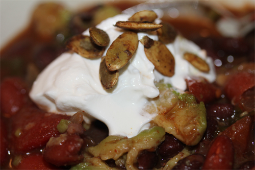 Add cilantro and avacados. Top with sour cream and garnish with 1 tablespoon pumpkin seeds.